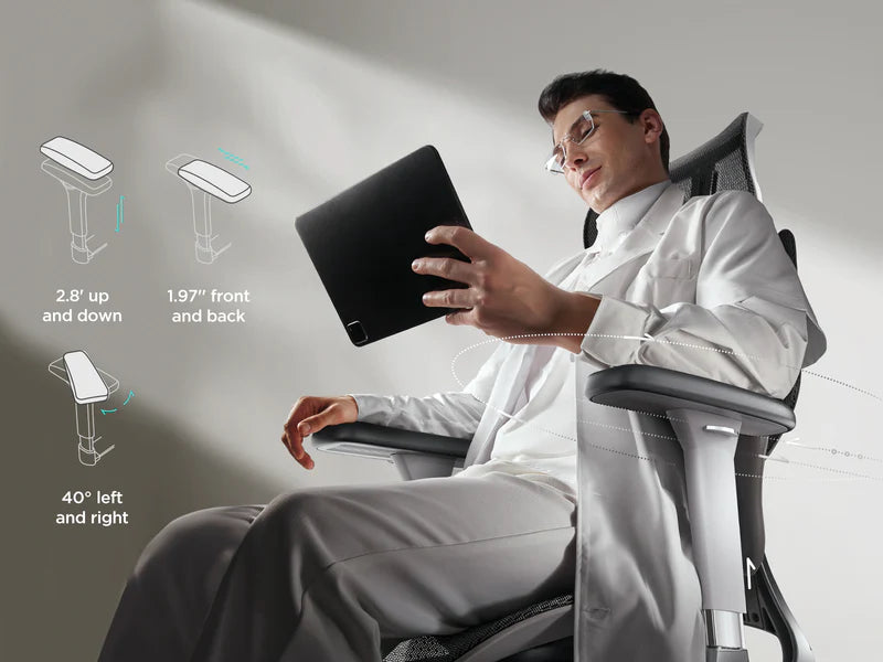 - پشتی و دستههای قابل تنظیم سهبعدی: پشتی سر با چرخش ۷۰ درجه و قابلیت تنظیم ارتفاع، و دستهها با تنظیم در شش جهت مختلف، امکان شخصیسازی کامل را برای هر کاربر فراهم میکنند.